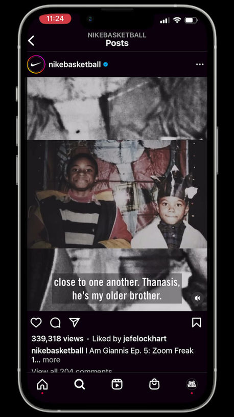 Just in time to celebrate Giannis Antetokounmpo’s first MVP season, we rolled out the biography for the "Greek Freak's" first signature shoe at the swoosh, the Nike Zoom Freak 1. Giannis’s game and persona transformed him into a household name, so Nike shared his story with the world. To pre-heat the launch of Giannis’s first shoe, we chronicled Giannis Antetokounmpo’s humble beginnings, rise to stardom, and dominance in the league through a story called, “I am Giannis”. We took the audience of @nikebasketball on a five-part journey about a tall, skinny kid from Athens, Greece, determined to make it to America to create a better future for his family. Throughout the story, we meet the people in Giannis’s life who profoundly impacted him and were instrumental in his path to success, highlighting the heart, humor, and grit that makes him a beloved superstar.